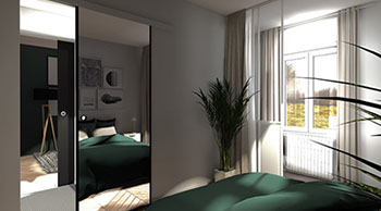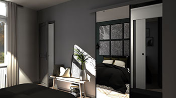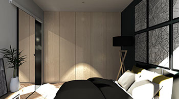 Par un système de coulissants vitrés à galandage, la première chambre peut être isolée ou non de l'espace couloir en fonction des besoins. Ainsi, ce réaménagement permet de distinguer deux réelles chambres, tout en valorisant au maximum l'apport de lumière naturelle même en second jour.