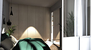 Le petit plus du projet a été d'ajouter un linéaire de rangements dans chacune des chambres afin de maximiser l'espace.