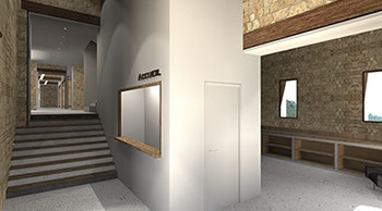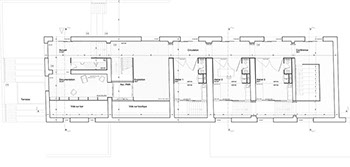 Une circulation unique a été pensé pour ce projet, afin de découvrir l'ensemble du bâtiment de l'accueil à l'espace boutique/bar, en passant par les ateliers d'artistes, l'espace projection ... Ainsi le visiteur chemine au travers des espaces tout comme il chemine à travers la démarche de l'artiste en résidence à ce moment même.
