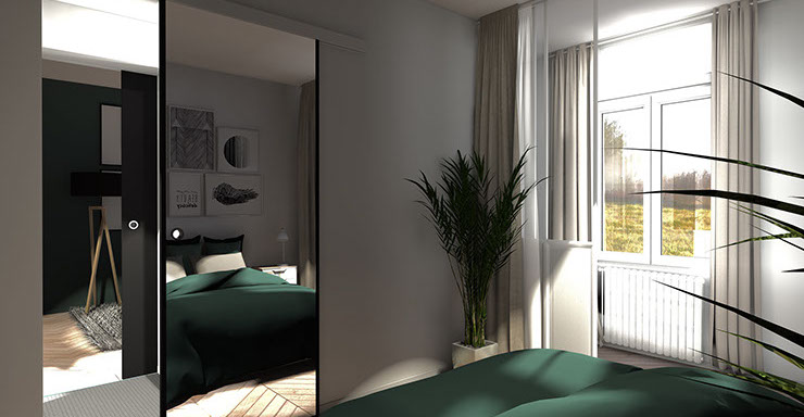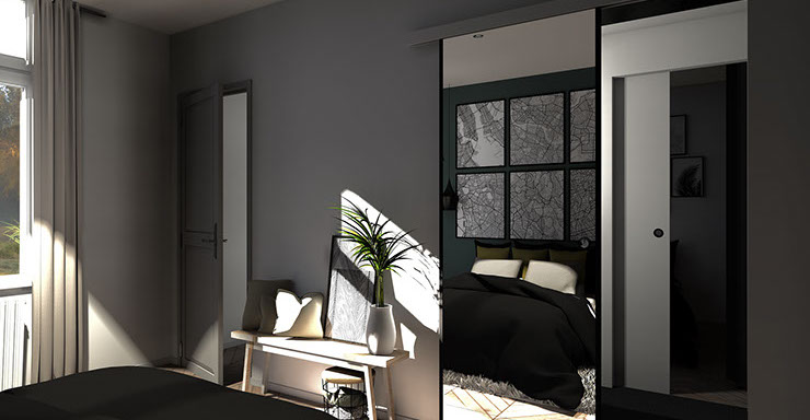 Par un système de coulissants vitrés à galandage, la première chambre peut être isolée ou non de l'espace couloir en fonction des besoins. Ainsi, ce réaménagement permet de distinguer deux réelles chambres, tout en valorisant au maximum l'apport de lumière naturelle même en second jour.