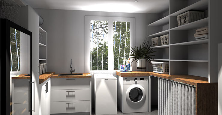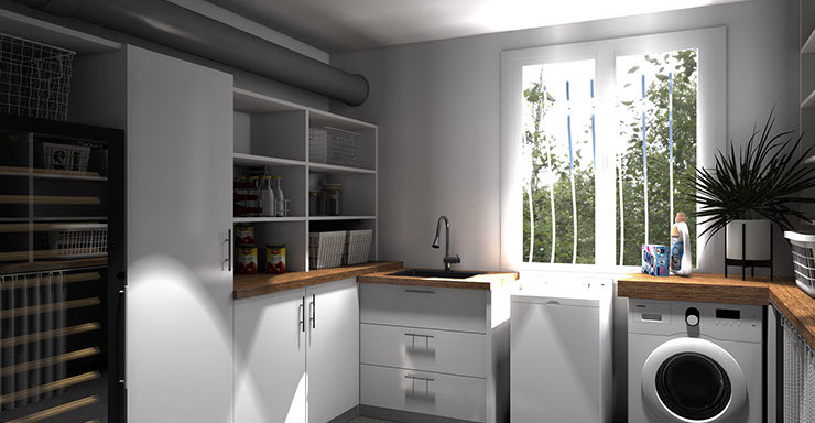 Il s'agissait de créer une vraie buanderie, pouvant accueillir frigo, congélateur, cave à vins. Maximiser l'espace pour obtenir le plus de rangements possibles. Créer un espace lumineux, fonctionnel et épuré.