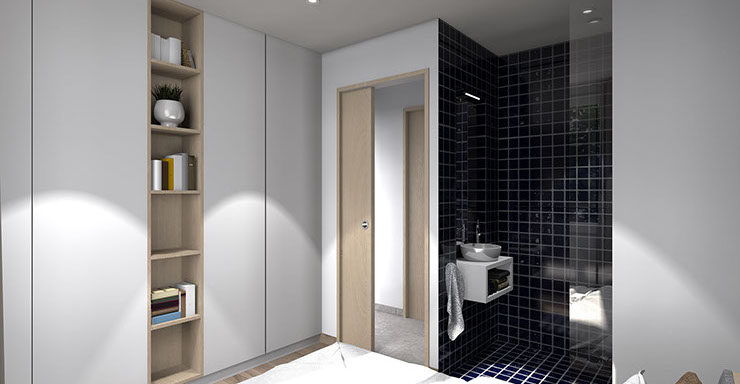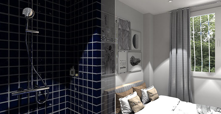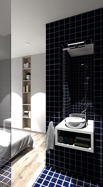 Dans l'autre partie, l'idée était de créer une véritable chambre d'appoint, avec un pan entier de rangements/bibliothèque. De, plus il fallait trouver une solution pour pouvoir installer un coin d'eau : douche et vasque dans la chambre. Ce dernier a été pensé comme un petit volume habillé de carreaux 10x10 bleu nuit sur toute la hauteur. Un meuble vasque sur mesure sera créé et intégré dans une niche afin d'accueillir un grand miroir et ainsi agrandir le volume.